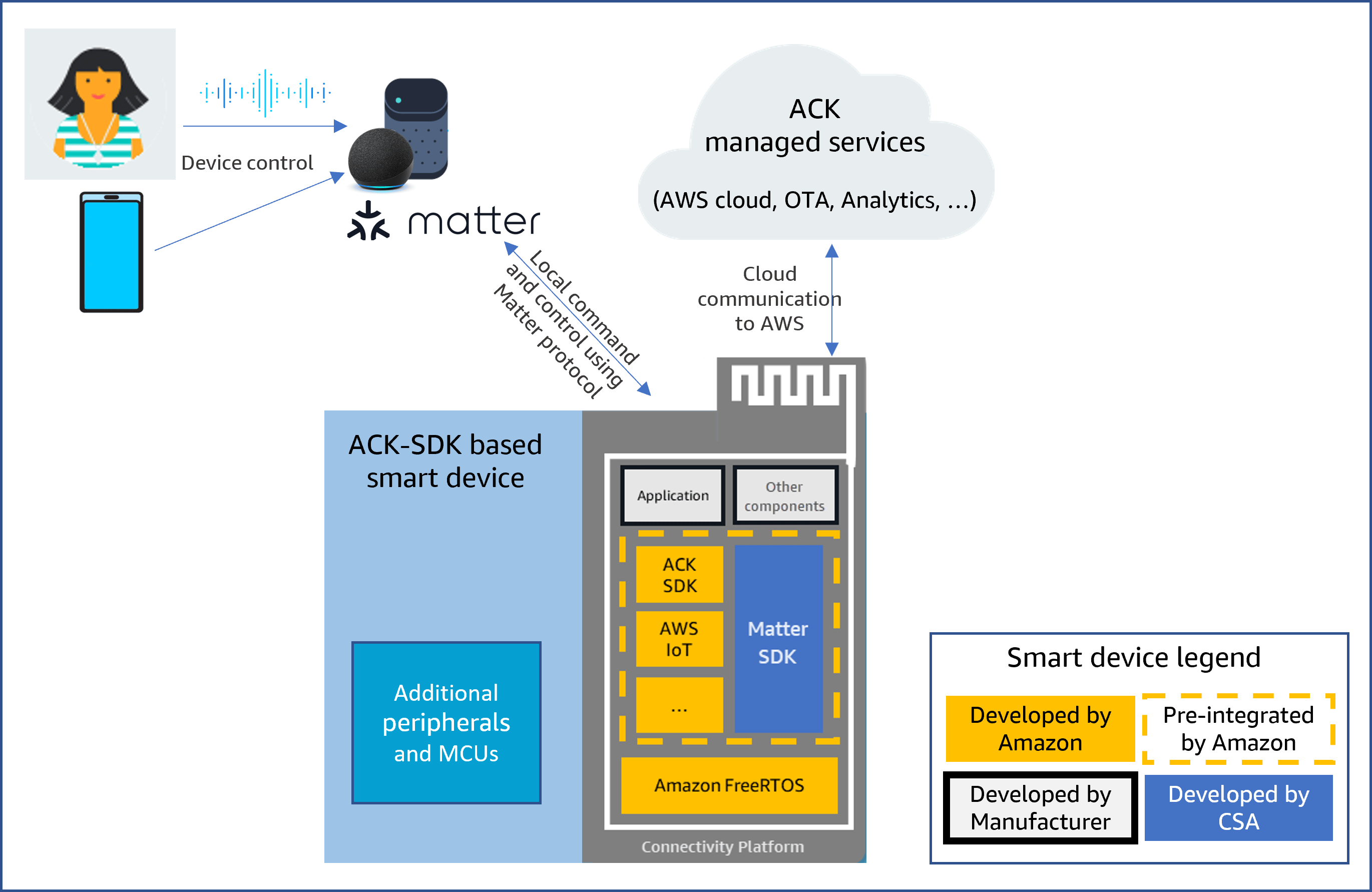 With the ACK SDK for Matter, you don't have to have expertise in the Matter protocol. The SDK has Matter command and control built in. To learn more about Matter, see Connectivity Standards Alliance (CSA).