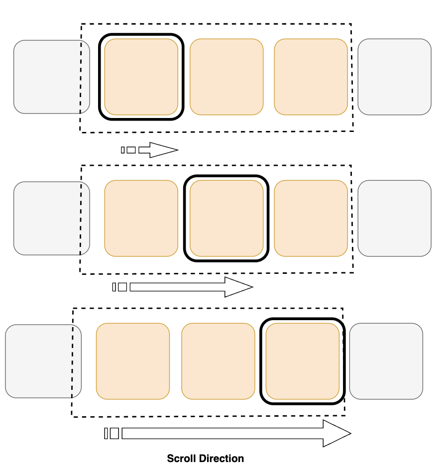 デフォルトでは、Carouselは水平方向に配置され、フォーカスのある要素の周りに白い境界線が表示されます。Carouselのビジュアルは、ユーザーがレンダリング関数で何を使用するかによって大きく変わる可能性があります。以下のデモからわかるように、Carousel内に配置するアイテムやアイテムの形状に制限はありません。アニメーションが必要な場合は、アイテムのデータに直接追加して渡すことができます。